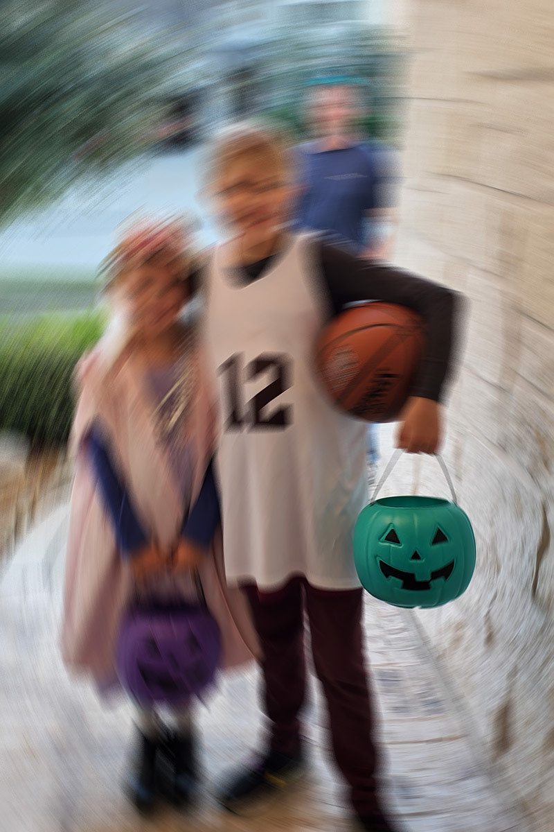 I am wanting to take a photo of the trick or treaters only and waiting for the father to exit the frame, however, he moves in and poses with them, his daughters.